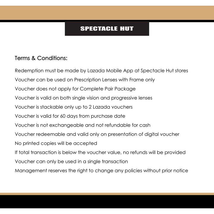 Please note that the voucher cannot be exchanged for cash and can only be used in a single transaction. Redemption can be done through the Lazada Mobile App at any Spectacle Hut store. Additionally, the voucher is stackable with up to 2 Lazada vouchers for even greater savings.